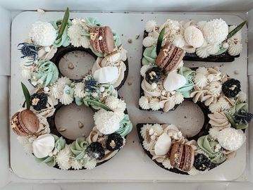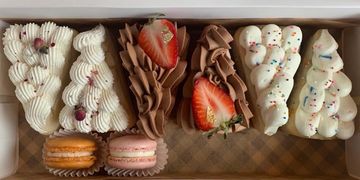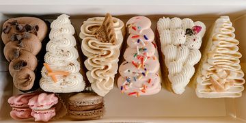 This box include 3 custom flavors of your choice of cake and buttercream combination, and a sampling of macarons.
