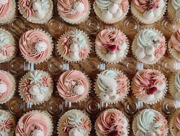 Each is customized and topped with buttercream, meringues, fresh fruit, macarons, cookies, fresh flowers, sprinkles, etc.